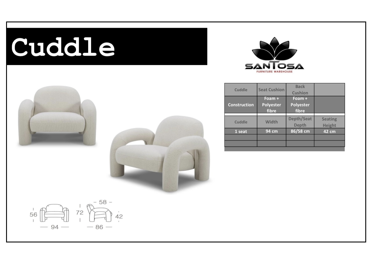 Our new favorite occasional chairs. The Cuddle Chair combines elegant design with luxurious comfort. Featuring a unique U shape arm rest and premium Boucle-style White Chenille fabric, it offers medium-firm support for optimal relaxation. Perfect for both lounge and bedroom settings, pairs beautifully with our Azito Sofa.Available to be ordered in a variety of fabric colors