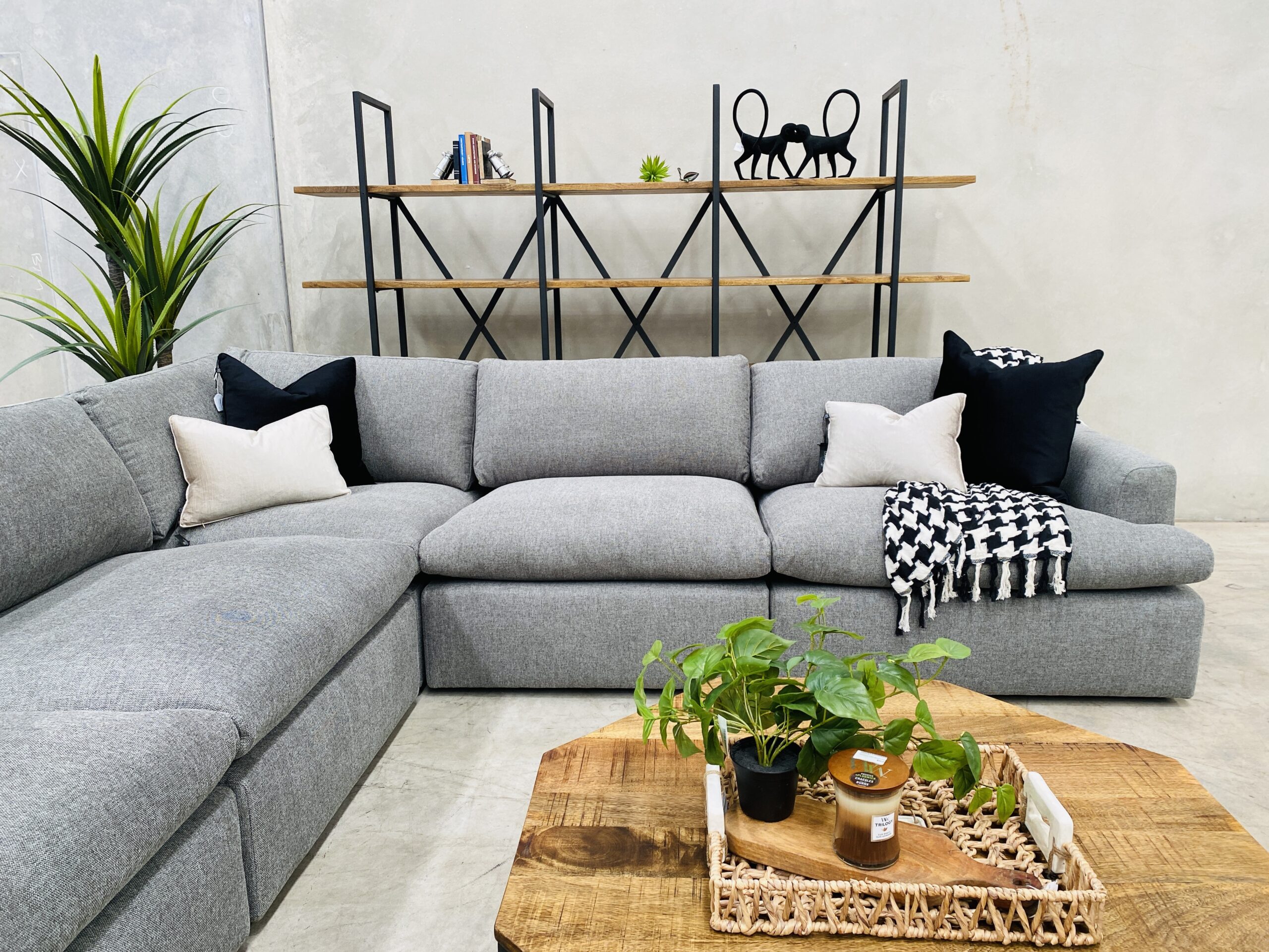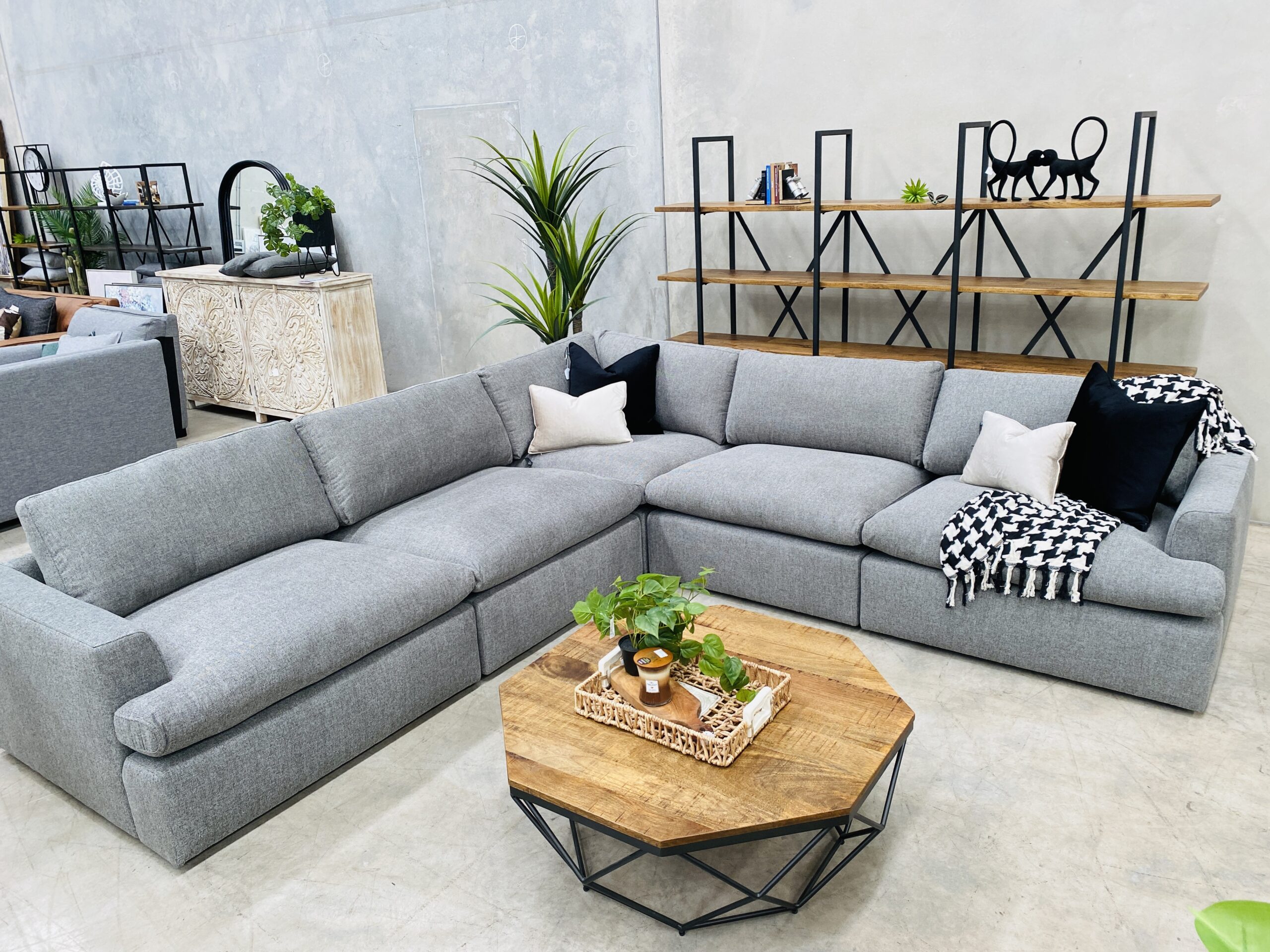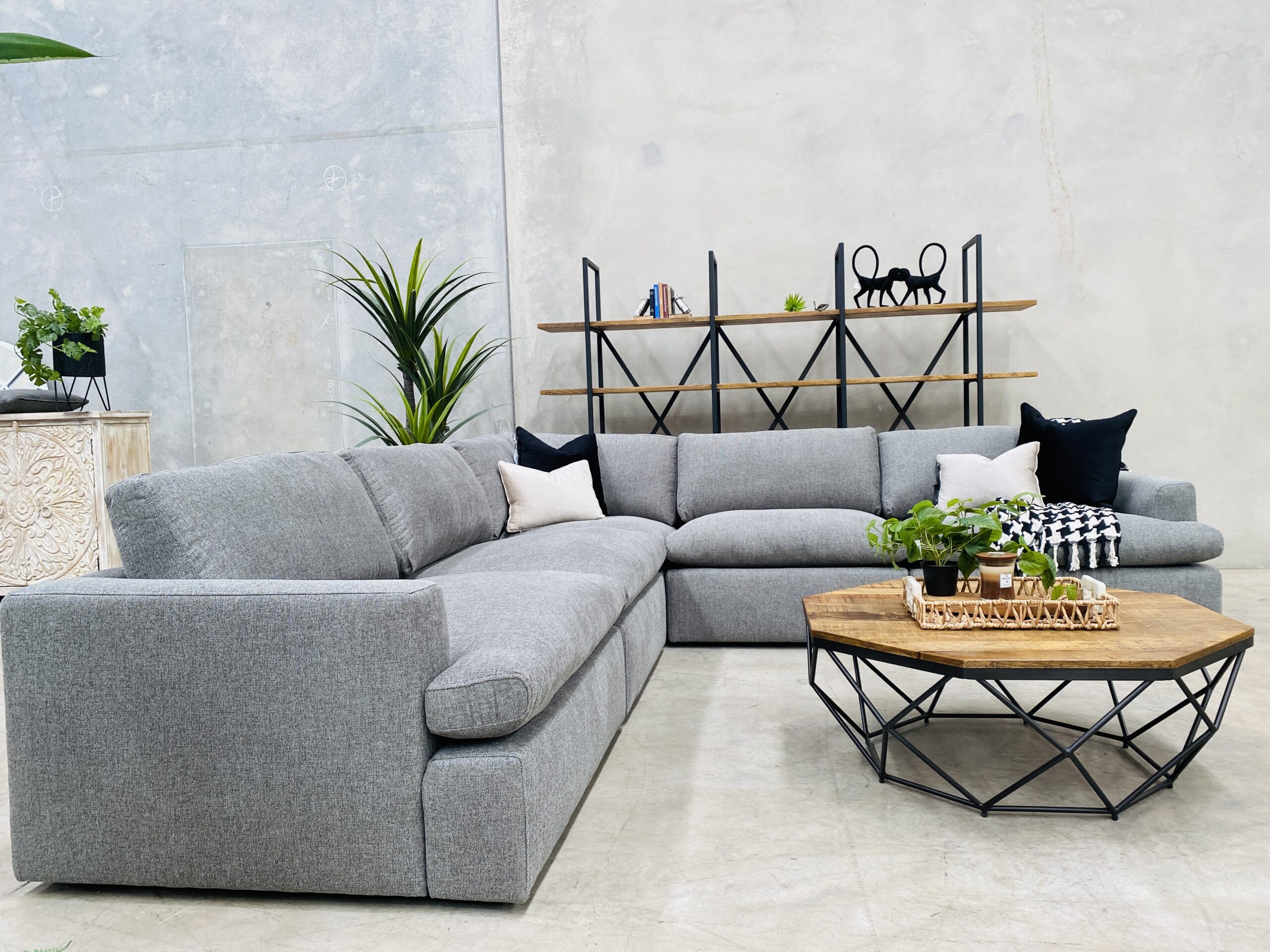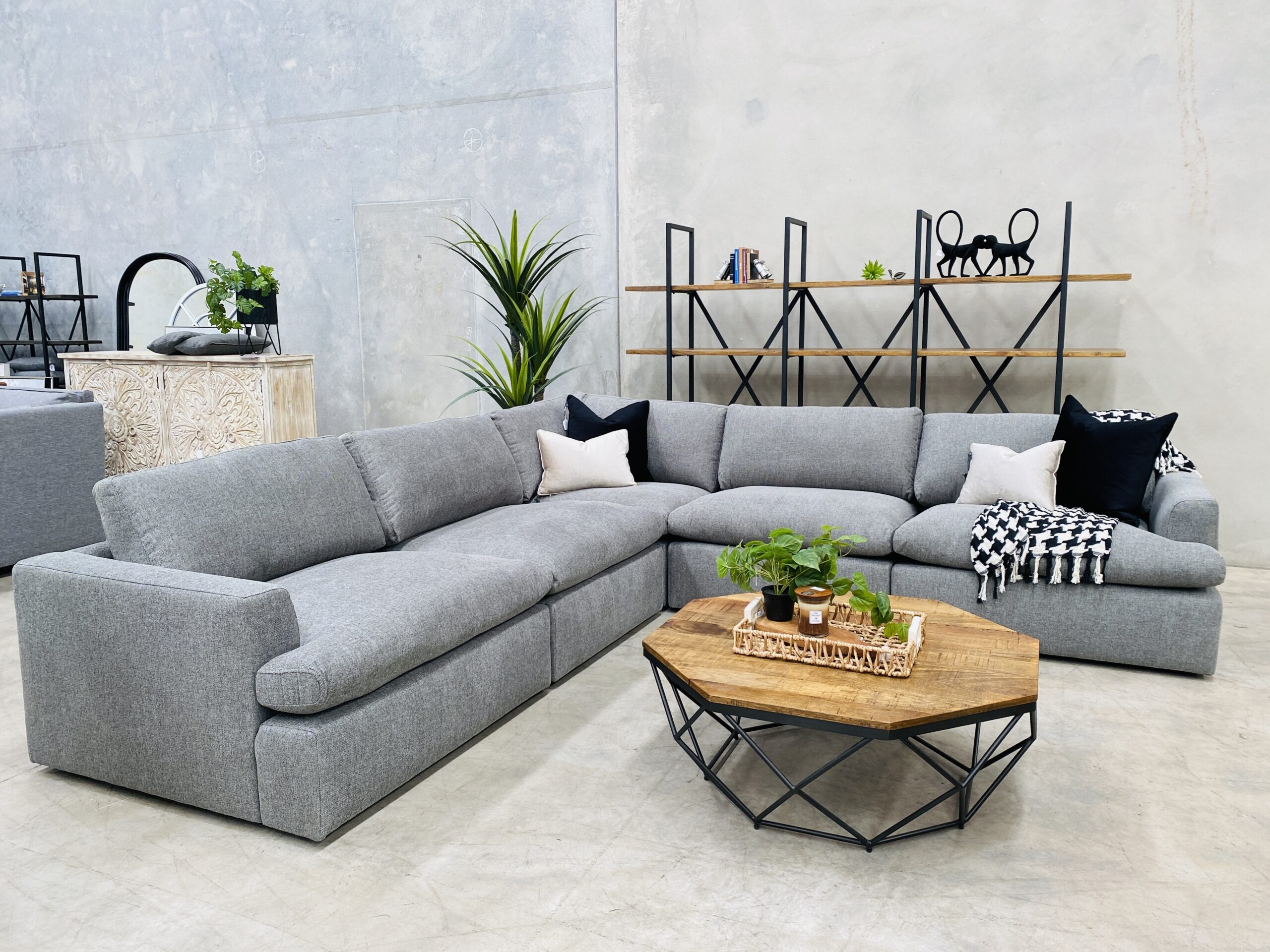 Introducing our Marshmallow modular lounge suite. A stunningly comfortable lounge, upholstered in soft texture cement fabric for classic and contemporary family living.Deep seating design and light pillow-topped cushions filled with down & fiber-blend cushioning.This livable modular features no-sag seating internals, with removable cushion covers for easy maintenance. Maintain its neat appearance and shape by ‘plumping’ up the feather & fiber filled cushions from time to time.