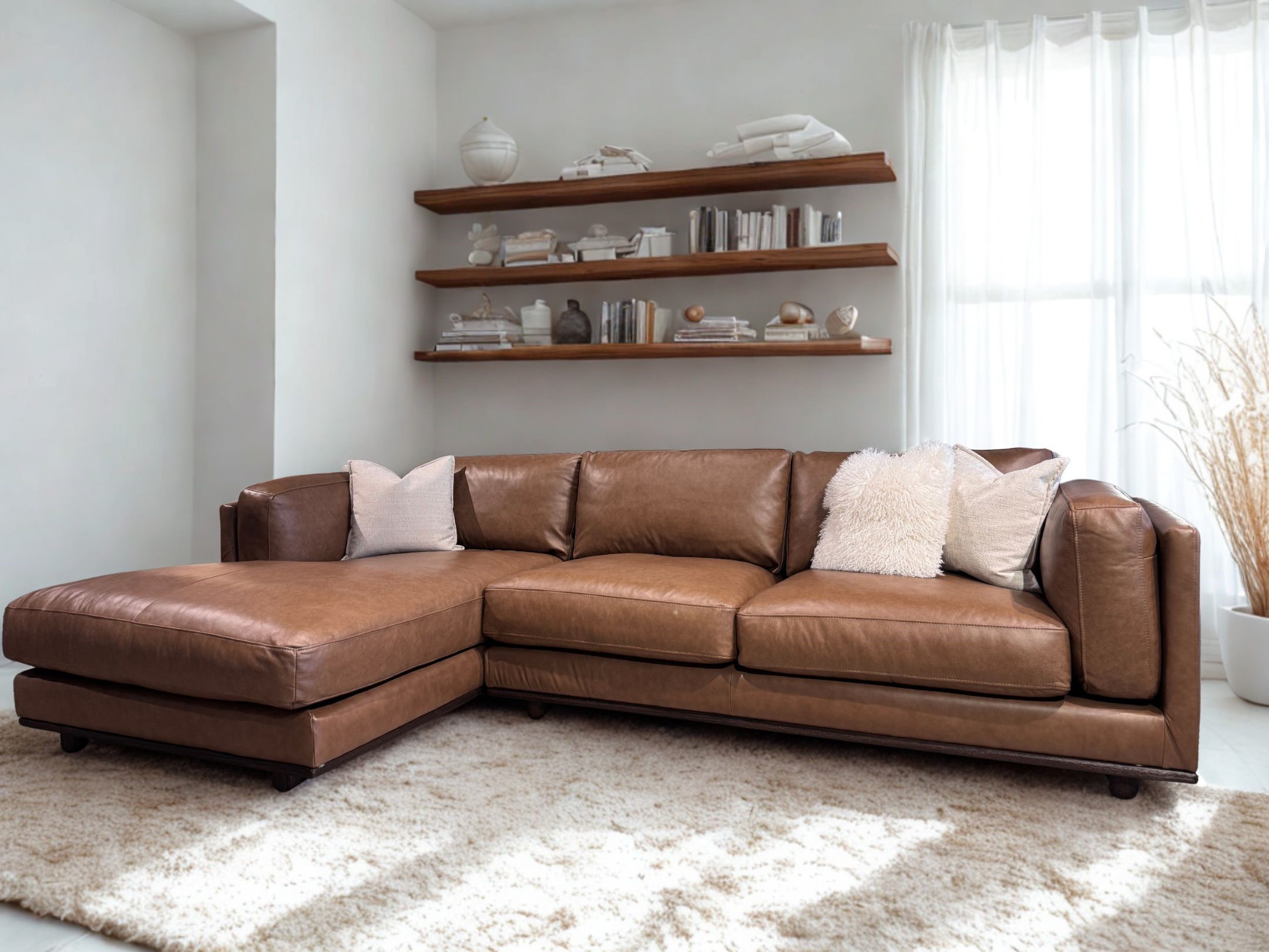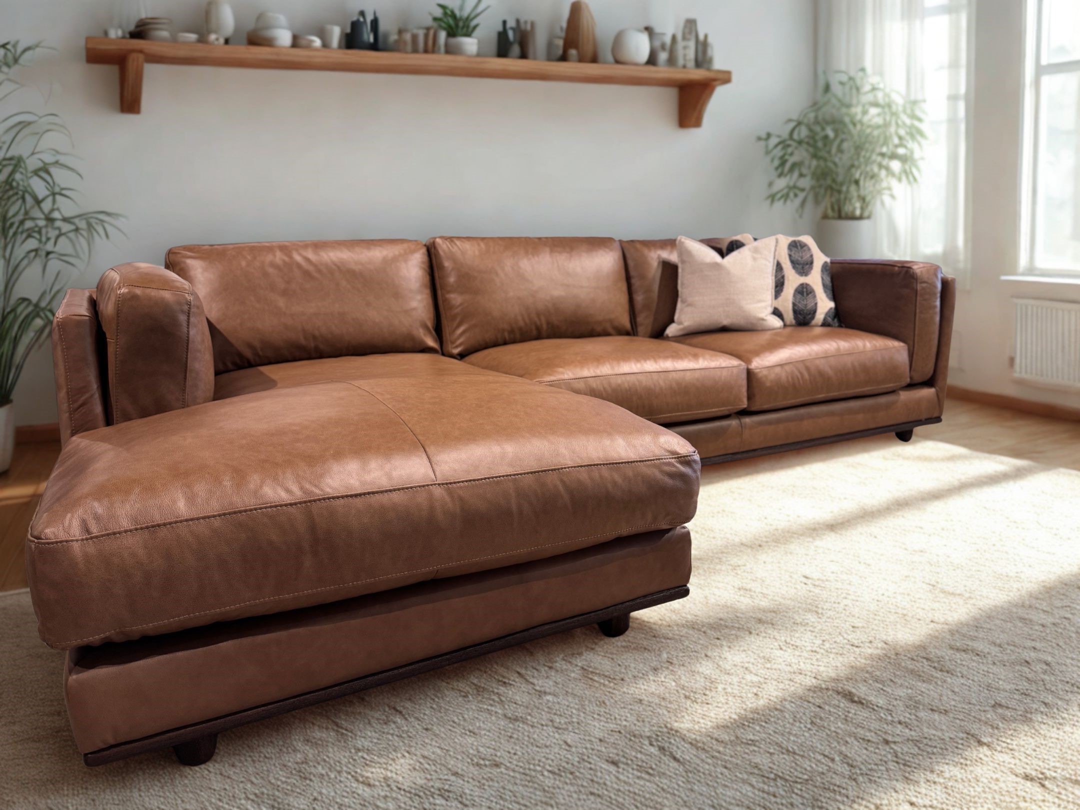 L shape leather lounge is featured in our soft Dakota semi-aniline leather,feather filled cushions and a timeless shape.Miami lounge combines a traditional and classic square padded arms with a handsome timber plinth base. Two-tone vintage look brown Dakota premium leather, soft to touch and