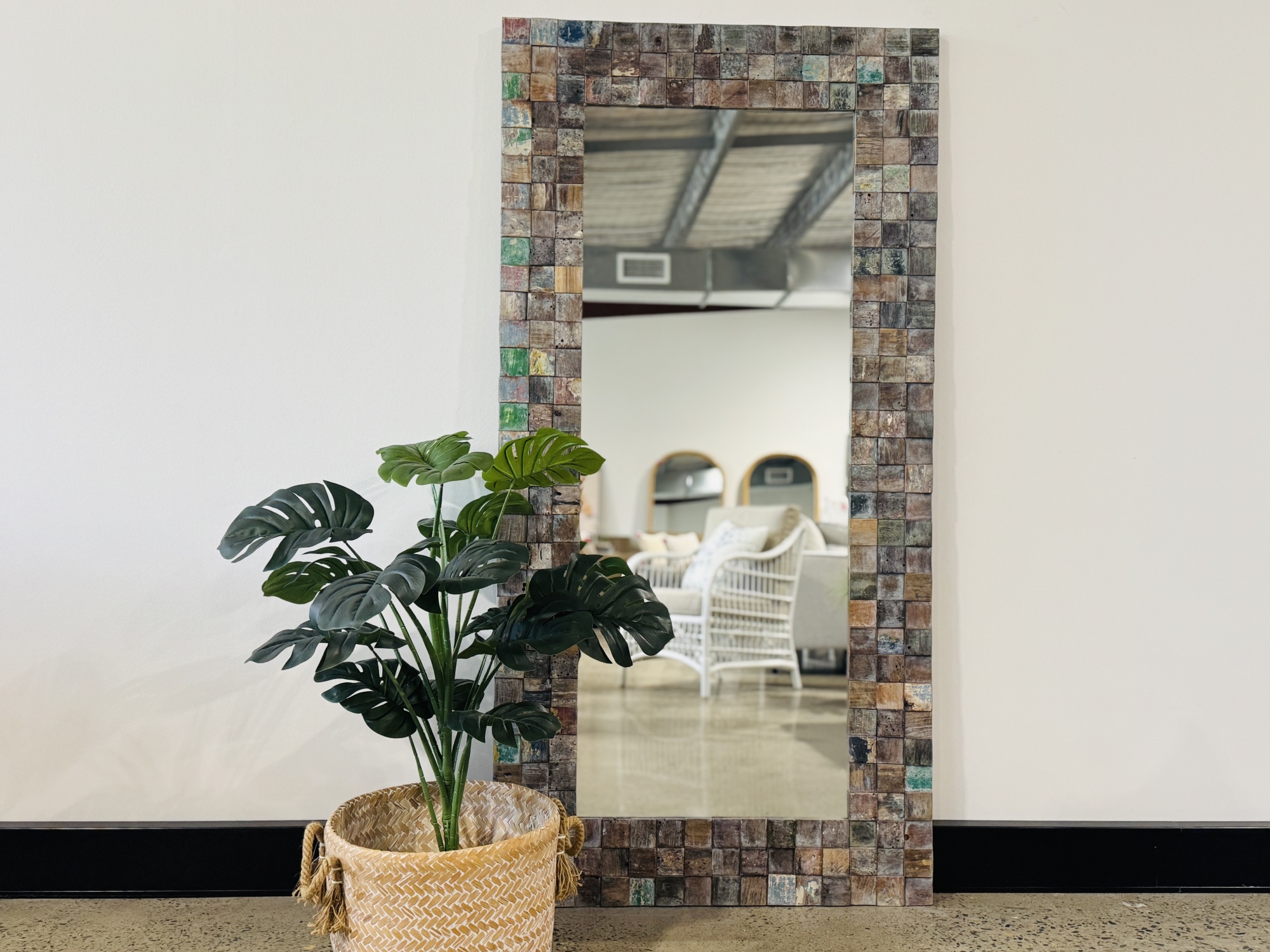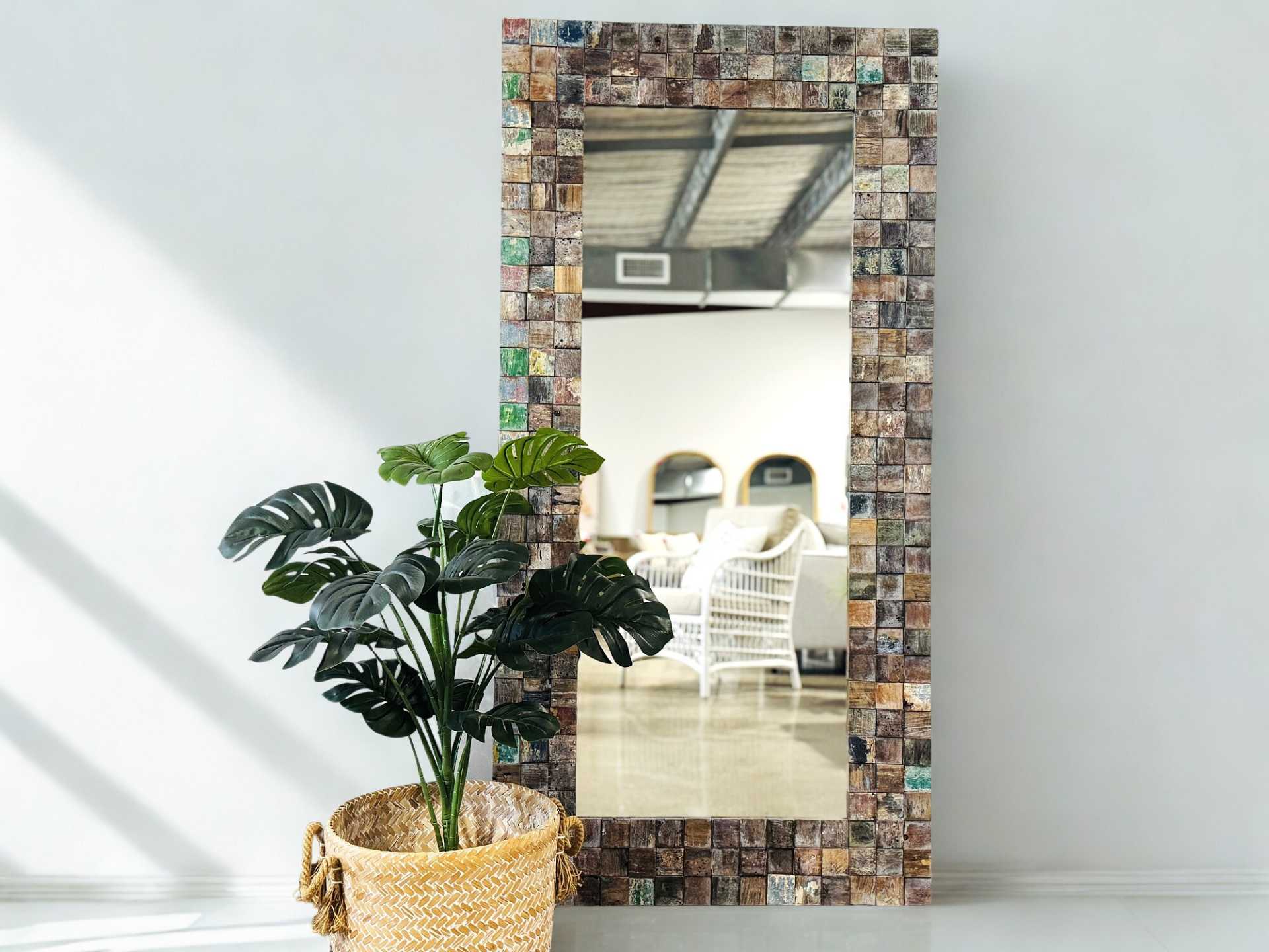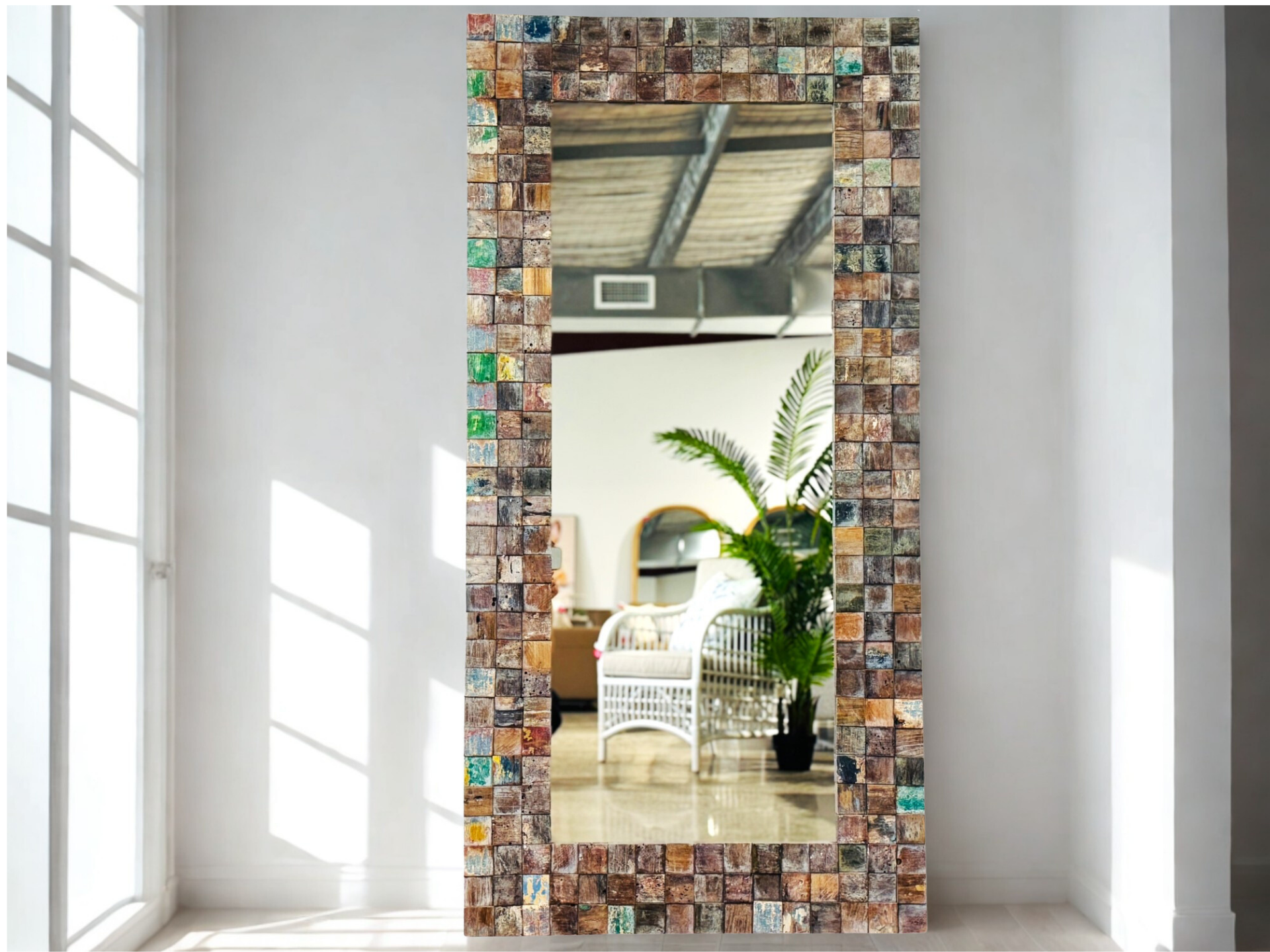 Elevate the interior of your home with our new Prahu Grid Mirror. The bespoke design is highlighted by the 3D grid pattern constructed from the recycle teak wood, featuring a cool mix of colors and textures handcrafted from old doors, old boats and old building frames. Each piece will be unique and a true statement in any room. This mirror can be hung vertically and horizontally, or leaned against the wall.