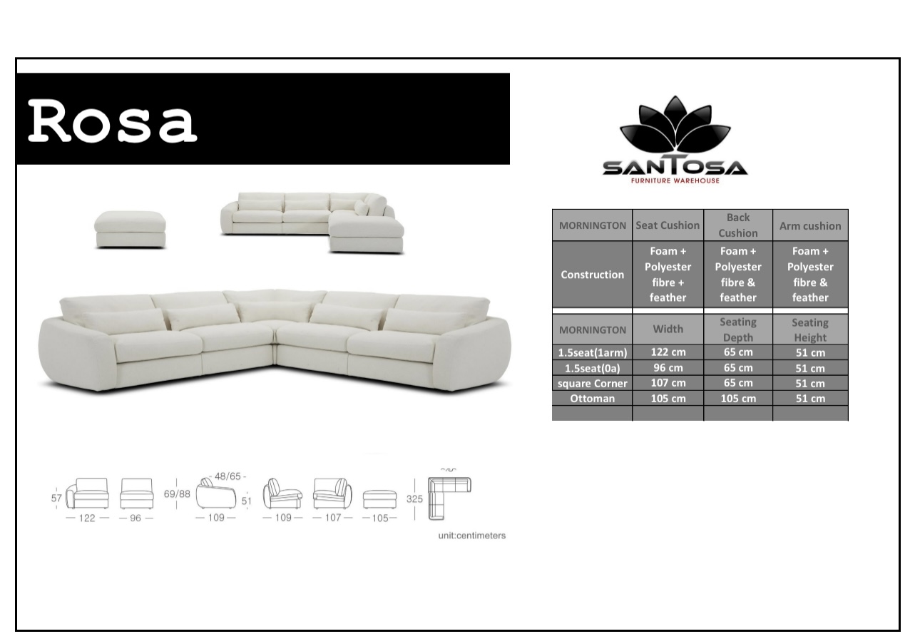The Rosa modular sofa is so comfy and relaxed, offering plush style cushions and large seating so you can spread out and chill.Modular formation to suit your unique space. Square ottoman designed to connect with any seating piece to create a chaise look comfort and is so flexible to move around or as a seating piece. Ease into the plush feather filled cushions and sink into an abyss of relaxation & comfort as your body shape conforms to the deep seated cushions and gentle back support.