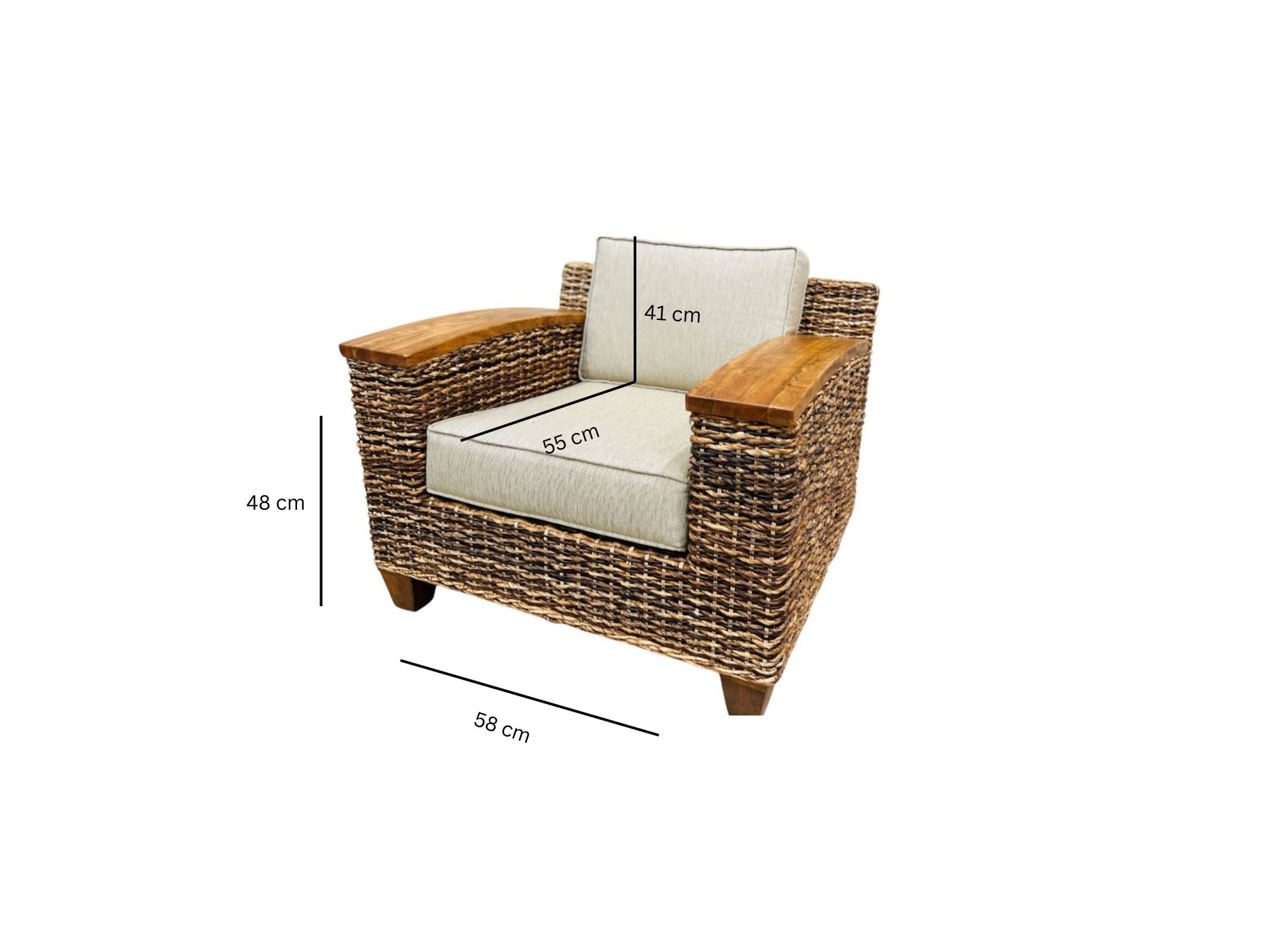 The banana leaf is twisted and braided to form a very strong rope. The rope is then woven over a solid mango wood frame mixed with sarang buaya to create an exciting and unique look that is made in both an environmentally and sustainable manner as well as being robust and very strong.